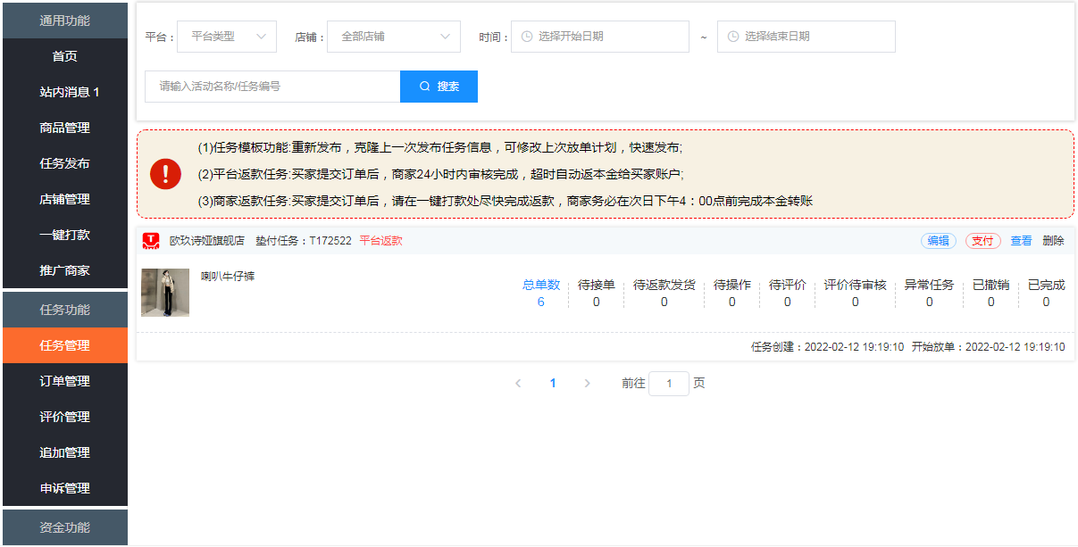 鱼塘补单平台具体的补单操作流程是:商家注册平台--绑定店铺--充值佣金(使用商家返款)--发布任务--48小时内给用户返款本金--物流到货-买家签收并且确认好评--任务完成。具体的操作教程,请您注册后进入商家后台详细查看。